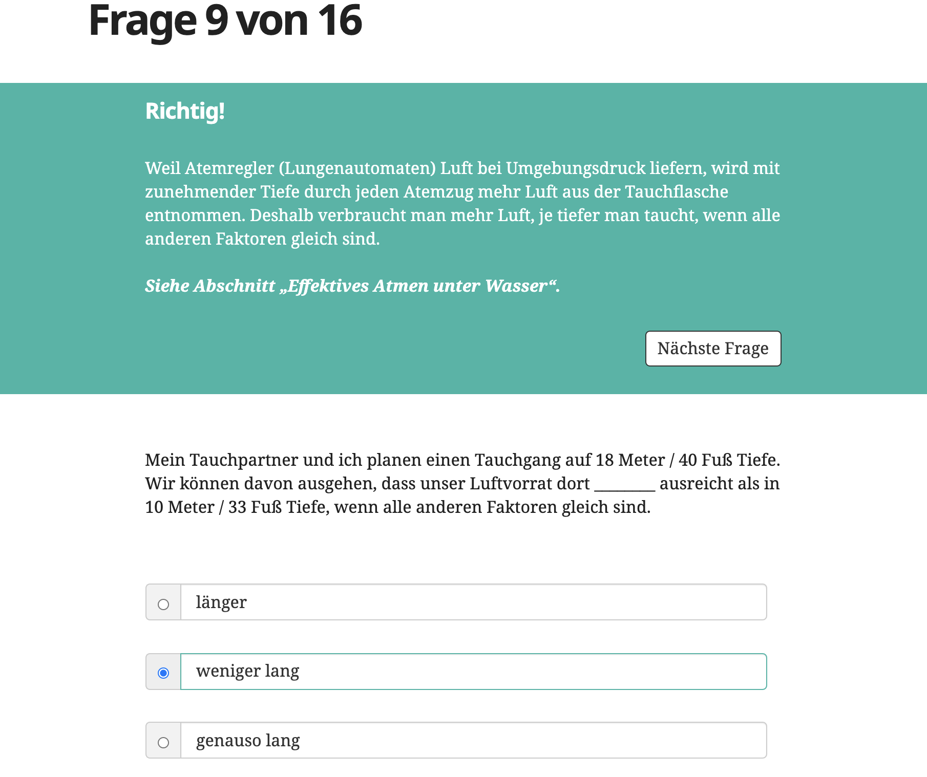 Insgesamt gibt es fünf Kapitel, die aus mehreren Unterkapiteln bestehen. Diese enden immer mit 16 Wiederholungsfragen und einem Quiz. Die Fragen lassen sich nur einmal beantworten. Sobald die Antwort abgeschickt wird, speichert PADI diese im Hintergrund für die Tauchschule ab.